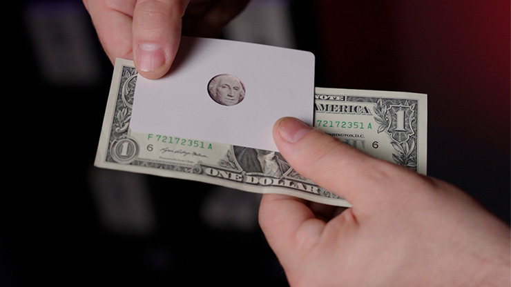 The HOLE CARD is placed over the DOLLAR BILL showing George Washington’s face. Without any moves you slide Georges head up to the top of the bill, then across to the right and then to the left. Finally you slide his head back onto his shoulders where it belongs. Immediately hand back the borrowed bill and show the card on both sides.