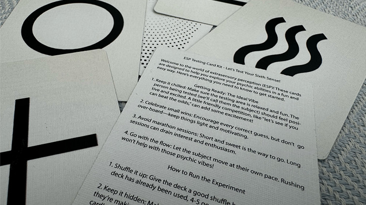 The 25 cards feature the classic symbols repeated five times, together withthree instructional cards that detail the history of the ESP cards, their design,and how to use them to actually test for ESP! These are great for curiousspectators, as they don’t reveal anything they shouldn’t, but for casualperformances fit the vibe perfectly, and the design is subtle enough that thecards can easily pass as an actual product for testing ESP, rather than a prop.