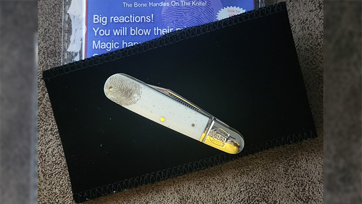 The spectator is given a small pocketknife to hold. They are asked to place it between their thumb and first finger. When their thumb is lifted away, their print is seen etched into the handle of the knife!
