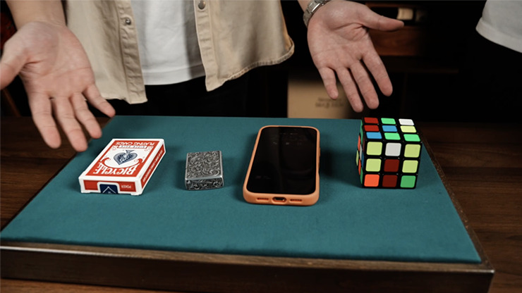 The magician borrows four random everyday items from the audience – a wallet, phone, air pod, or any small object the spectator is carrying. All items are placed openly on the close-up pad.