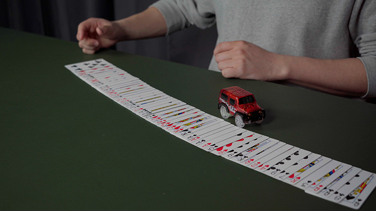 A toy car moves and then stops on its own. Look at the card where it stops, and it’s the spectator’s card. - Lamp
